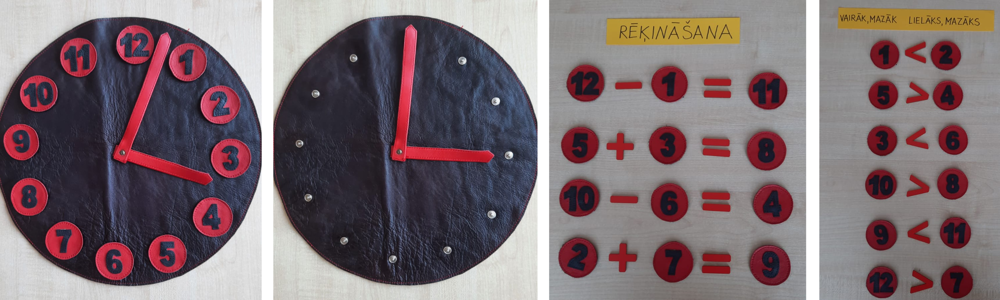 Unda Grūbe no Valmiermuižas PII “Burtiņš”, izstrādājot skaitļošanas spēli–pulksteni no otrreiz izmantotas ādas jakas. Spēle paredzēta 5–6 gadus veciem bērniem. Tā palīdz apgūt skaitļu rindu no 1 līdz 12, noteikt trūkstošos skaitļus un saprast pulksteņa ciparnīcu. Bērni mācās atšķirt pāra un nepāra skaitļus, noteikt skaitļu kaimiņus un lietot jēdzienus “vairāk” un “mazāk”. Ar kustīgajiem rādītājiem viņi apgūst arī laika noteikšanu.