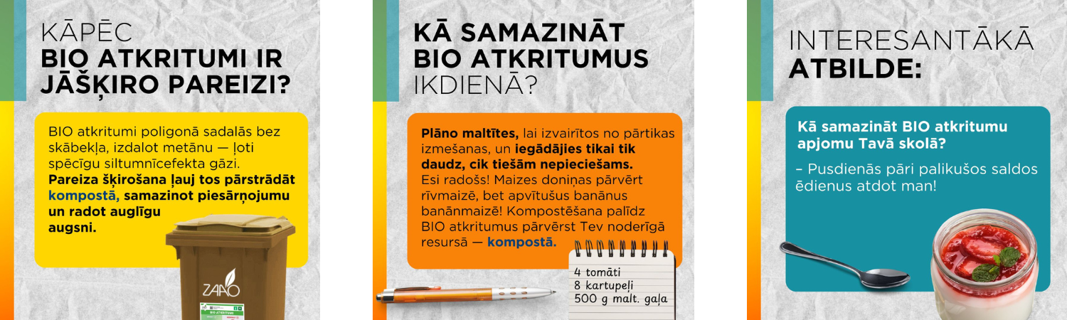 Jauniešu atbildēs redzams, ka viņi labi apzinās riskus, ko rada nepareizi apsaimniekoti BIO atkritumi, un kā galvenos risinājumus min pārdomātāku maltīšu plānošanu, pārtikas izšķērdēšanas mazināšanu un aktīvāku šķirošanu un kompostēšanu mājās un skolā. Tika uzsvērts, ka infrastruktūra — brūnie konteineri un skolu komposta vietas — jau daudzviet ir pieejama, taču tās pilnvērtīgai izmantošanai jāstiprina ikdienas paradumi. Kā praktiskus uzlabojumus jaunieši piedāvā precīzāku porciju pasūtīšanu skolas ēdnīcā, organisko atlieku kompostēšanu un izglītojošas aktivitātes, kas veicinātu izpratni par atkritumu samazināšanu. Vienlaikus norādīti arī galvenie šķēršļi — nepareiza šķirošana, nepietiekamas iespējas daudzdzīvokļu rajonos, smakas un kaitēkļi, ja konteineri netiek iztukšoti regulāri, kā arī kopumā zema sabiedrības izpratne par BIO atkritumu ietekmi un pārstrādes nozīmi.